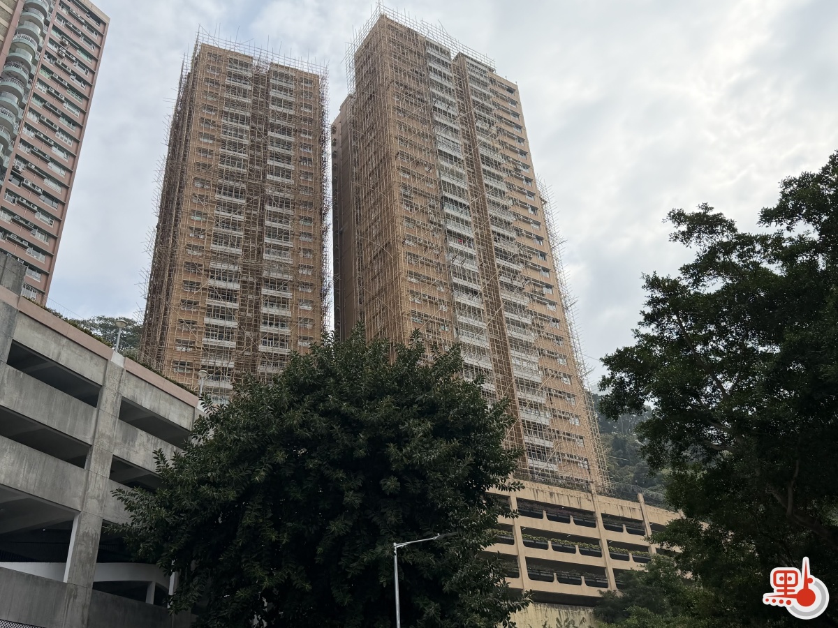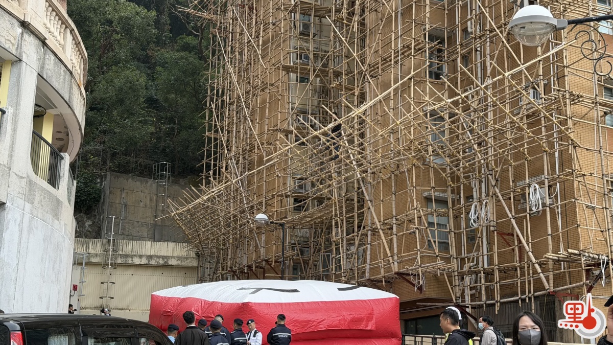 【點新聞報道】大埔宏福苑維修工程承辦商「宏業建築工程有限公司」在五級火後被揭棚網報告疑造假,公司兩名董事及一名工程顧問被捕,多個項目需要停工。其中,薄扶林豪宅碧瑤灣同由宏業建築工程承辦大維修。今日(28日)上午9時,約10名工人在碧瑤灣一幢正在搭建棚架的大廈旁,拉起寫上「有汗出無糧出」的橫額,追討數百萬欠薪,更有工人涉險爬上棚架危坐。至中午12時許,點新聞記者現場看到,仍有兩名建築工人置身棚架上,其中一名工人在中層位置的棚架站立,並不時調整姿勢。現場有大批警員與消防戒備。