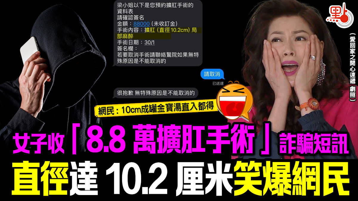 【點新聞報道】騙徒手法層出不窮,近日社交平台流傳一則報稱來自「醫院」的預約提示,指女事主已預約進行一項費用高達 8.8 萬元的「擴肛手術」,更列明直徑要擴張至10.2厘米,且強調「如果無特殊原因是不能取消的」。由於內容極其荒謬兼漏洞百出,隨即引發網民熱議。