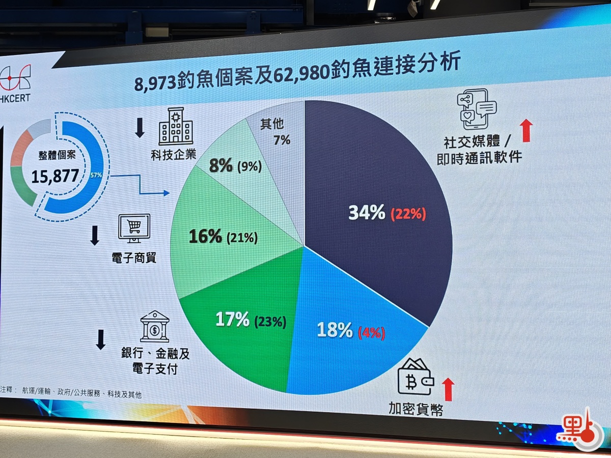 報告顯示,在整體個案中,「網絡釣魚」佔比最高達57%,按年增長15%。當中社交媒體及加密貨幣平台的詐騙個案有上升趨勢,分別按年增加22%及4%。