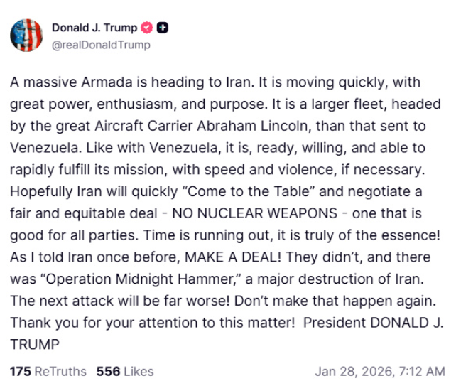 【點新聞報道】據新華社報道,美國總統特朗普28日在社交媒體上說,一支龐大的艦隊正前往伊朗,已準備好迅速履行其使命。他還稱,希望伊朗能夠迅速坐到談判桌前。
