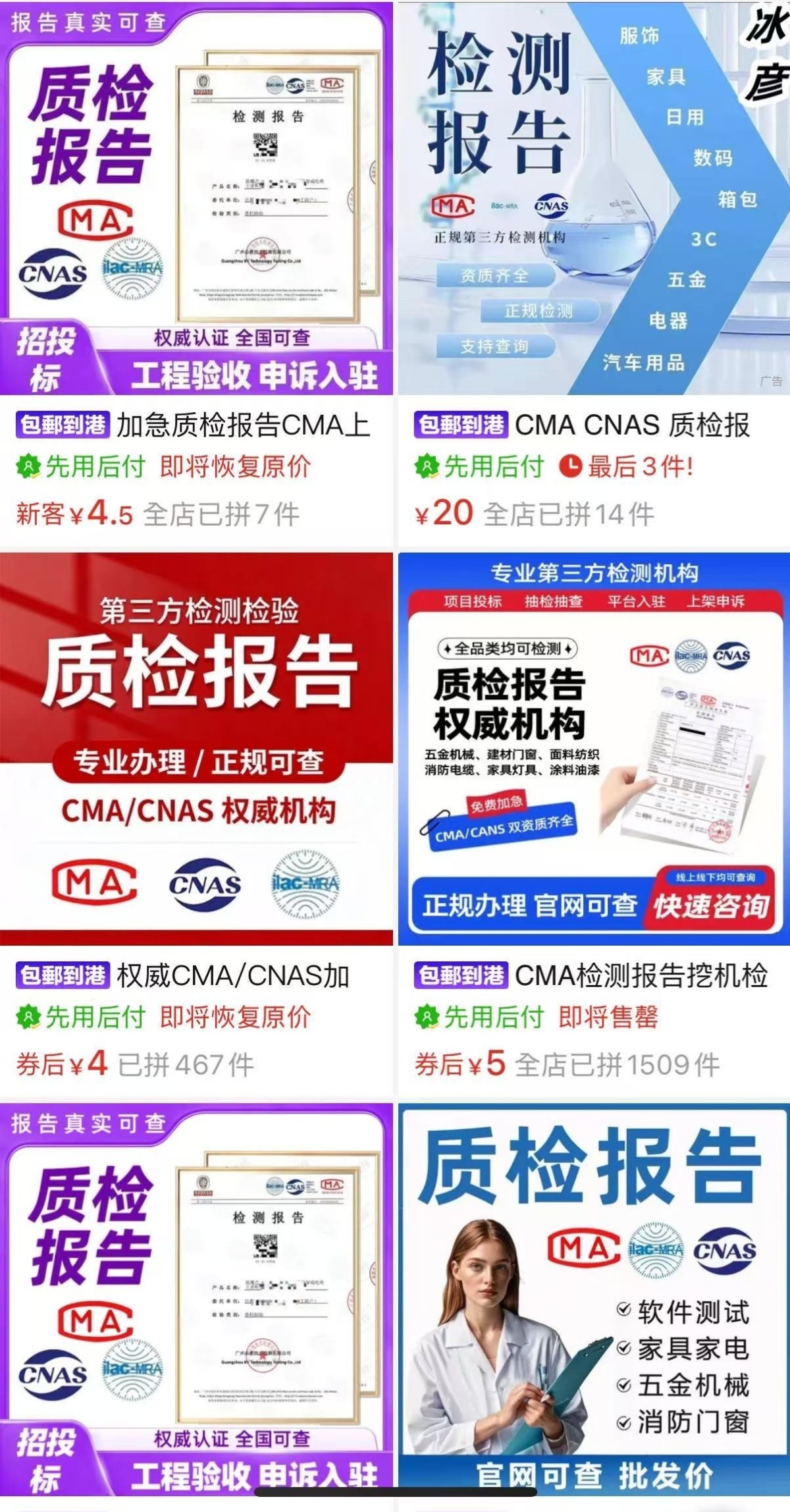 除了棚網之外,該電商平台還販售各類「質檢報告」。搜索「質檢證明」、「質檢報告」等詞條,可見幾千件有關產品,涵蓋食物、服裝、傢具及建材等各類別,應有盡有。商家大多以幾元至幾十元低價作招徠,其後客服會根據消費者需求定價,最終可以逾百元至逾千元購得報告。