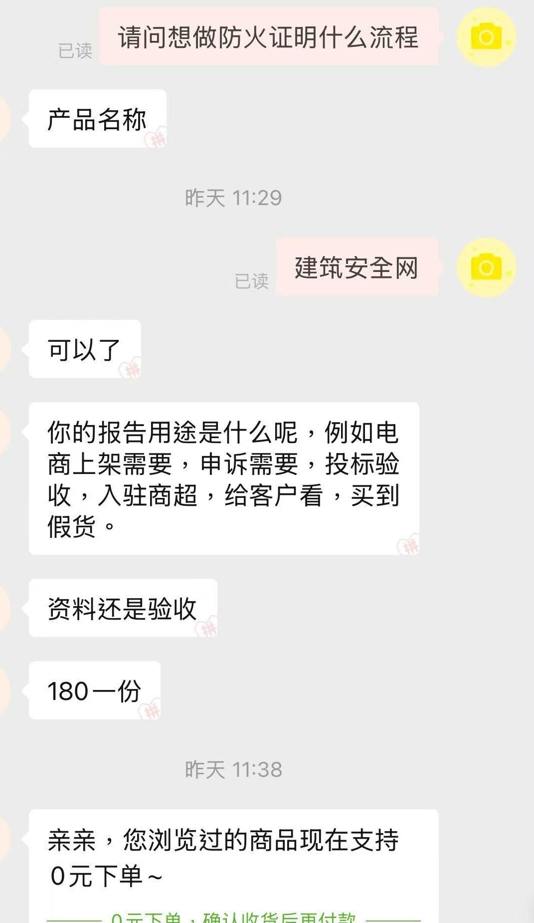 記者以「電商上架需要」為由向一商家求購「建築安全網防火等級證明」,對方未經任何核查即表示可以人民幣180元(約198港元)購買,且無需送樣檢測,只需要發送公司單位、公司地址、產品名稱和產品圖等信息即可獲得所謂「防火等級證明」,消費者甚至可以自行提供「檢測標準要求」。