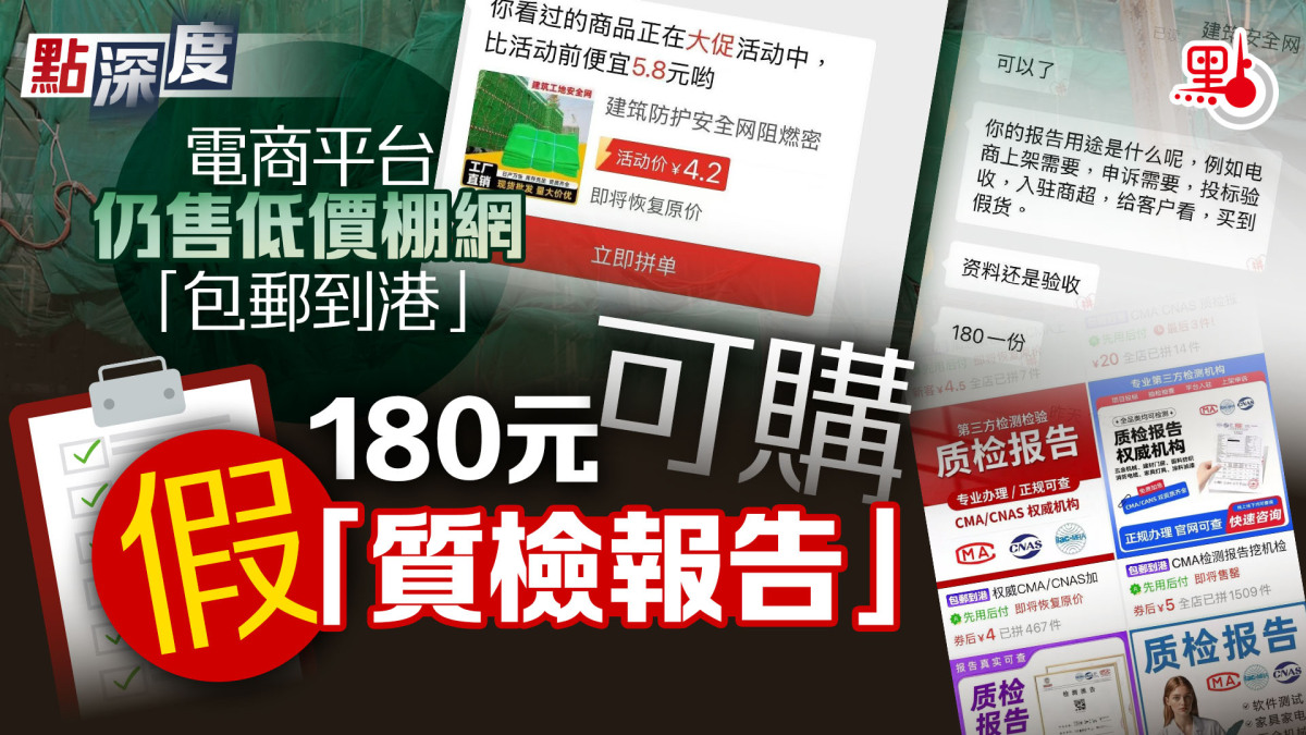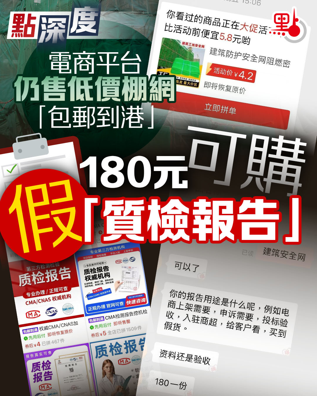 點新聞記者亦就棚網質量深入追蹤,先是獨家揭露碧瑤灣第四期大維修同樣由宏福苑大火涉事工程公司宏業建築承辦,實測發現其所用棚網「遇火即燃」,懷疑檢測報告造假。其後,記者發現跨境電商平台拼多多有大量廉價阻燃棚網售賣,並且包郵到港,其中有商家「自曝」產品並不阻燃,廣告為虛假宣傳。平台上更有售「質檢報告」,無需送樣、只需幾百元就能量身訂製仿冒防火證明。上述跨境電商亂象讓人不寒而慄——這些來路不明的「安全網」究竟在守護安全,還是會成為潛藏的致命危機?
