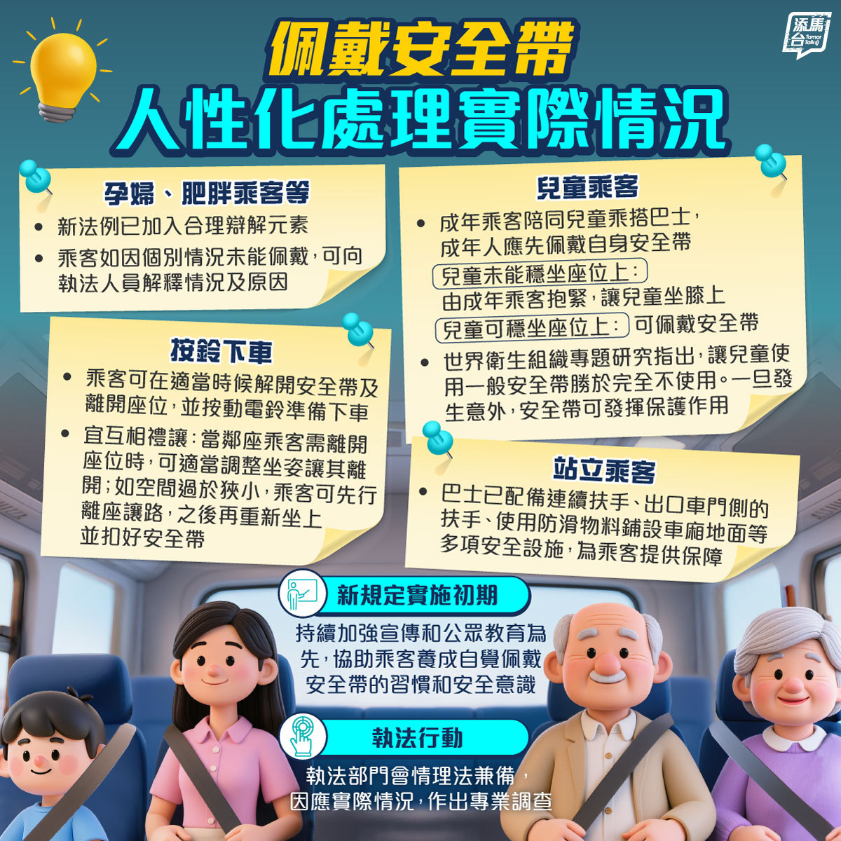 成年乘客陪同兒童乘搭巴士,成年人應先佩戴自身安全帶