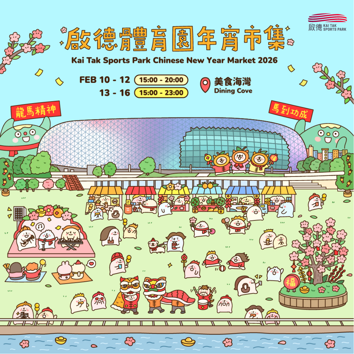 2月1日至3月上旬,體育園內的啟德零售館還將同時化身室內年宵市集,雲集多個新春市集及期間限定店,包括堪輿學家麥玲玲推出「麥玲玲吉慶堂限定店」,帶來眾多開運精品及馬年運程書等;日式超市AEON的「AEON新春賀歲食品節」帶來各式拜年必備賀年禮盒;「Thank You Florist限定店」以新鮮到港的年花及盆栽與大眾一同迎新春;「醇酒市集」搜羅多種特色佳釀,為你的新年歡聚做好準備;「Figurecross2026年宵及新春市集」更帶來數10個攤位,為大家提供各種賀年應節擺設好物及精品。