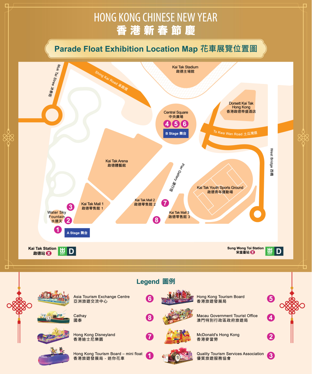 除驚喜購物環節,大年初一「國泰新春國際匯演之夜」的花車將於2月18至26日,首度於體育園驚喜展出。2月18至19日期間,10多支參與匯演的內地及國際表演隊伍,更會於體育園內增設的兩個舞台即場獻技,以超高水準的精湛表演,將新春氣氛送給現場觀眾。