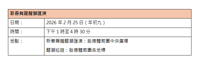 2月25日(年初九),體育園將進行「新春舞龍醒獅匯演」,以傳統跳樁採青表演賀歲,向大眾送上吉祥如意、好運生財的祝福。屆時,醒獅隊伍更於體育園區內,包括中央廣場、啟德零售館等各地標巡遊,把滿滿福氣及熱鬧氣氛傳遍每個角落。