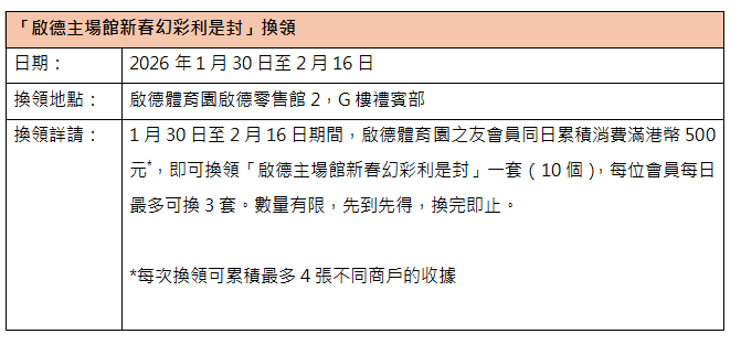 1月30日至2月16日期間,啟德體育園之友會員同日累積消費滿港幣500元,即可換領「啟德主場館新春幻彩利是封」一套(10個),每位會員每日最多可換3套。數量有限,先到先得,換完即止。