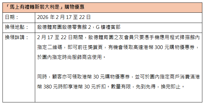 2月17至22日期間,啟德體育園之友會員只要憑手機應用程式掃描館內指定二維碼,即可前往獎賞頁,有機會領取高達港幣300元購物優惠券,於園內指定時尚服飾商店使用。同時,顧客亦有機會領取港幣30元購物優惠券,並可於園內指定商戶消費滿港幣380元時即享港幣30元折扣。數量有限,先到先得,換完即止。