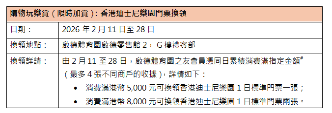由2月11至28日,啟德體育園之友會員憑同日累積消費滿指定金額,可換領香港迪士尼樂園1日標準門票,每位會員每個獎賞只可換領一次。數量有限,先到先得,換完即止。