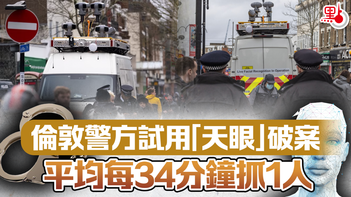 【點新聞報道】英國倫敦警察局近期在南倫敦克羅伊登進行一項測試計劃,在現有建築物如燈柱上安裝「天眼」(人臉辨識鏡頭),系統令他們「平均每34分鐘就抓到一名在逃疑犯」,結果在短短3個月內便成功拘捕100名疑犯。