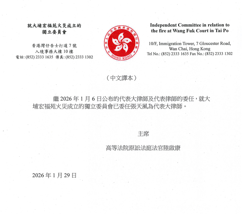 【點新聞報道】去年發生的大埔宏福苑大火死傷慘重,行政長官李家超早前宣布成立獨立委員會,審視事故原因及相關問題,並提出建議,由陸啟康擔任獨立委員會主席。委員會早前委任5位代表大律師,根據獨立委員會網頁今日(29日)最新通告,再委任張天風為代表大律師。
