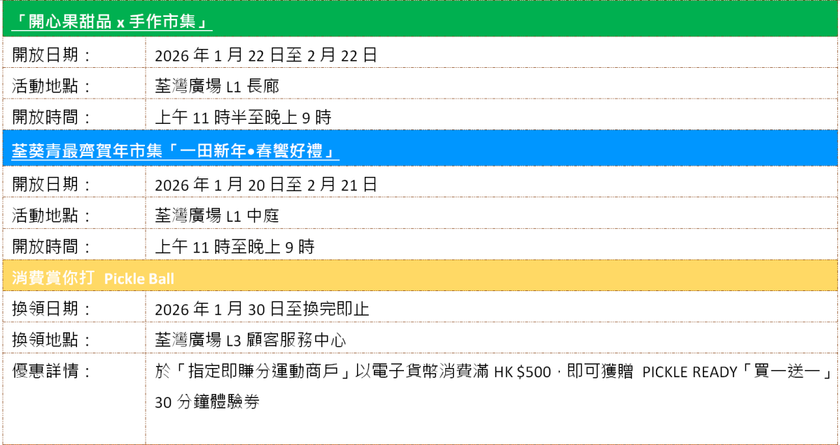 即日起至2月22日,荃灣廣場L1長廊呈獻開心果甜品手作市集,人氣小店輪流登場,每周驚喜不同!包括均香餅家開心果Mochi;CATCHI招牌開心果三重奏麻糬;A.D.C.開心果系列特飲咖啡;Madness Family必試開心果味Gelato;Hola,planta!迷你療癒小盆栽等!一年一度荃灣最強賀年市集「一田新年·春饗好禮」亦載譽歸來,集合各款人氣賀年禮盒、高級海味與節慶裝飾,一站式辦妥團年飯與節日送禮。此外,全新運動科技品牌進駐,讓大家迎接健康新一年,帶來風靡全城的Pickleball匹克球場館PICKLE READY,1月30日起,於指定運動商戶即日消費滿港幣$500,即可獲贈PICKLE READY「買一送一」30分鐘體驗券!以及專業運動科技品牌Garmin智能手錶,讓你動感滿滿迎馬年!