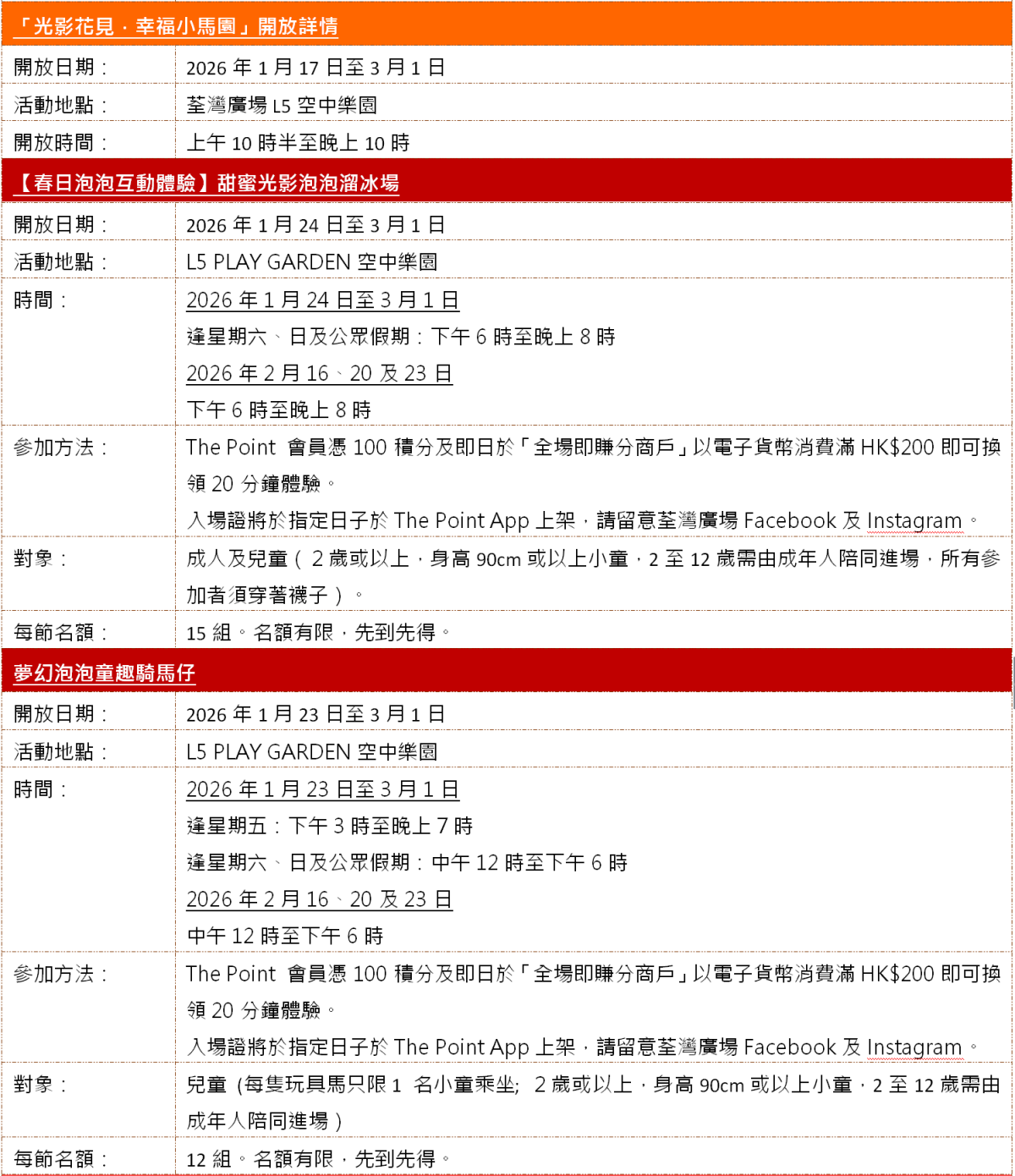 荃灣廣場亦於L5空中花園呈獻新春主題活動「光影花見·幸福小馬園」,以「泡泡、光影、花見」為主題,設有3大春日泡泡互動體驗及2大祈願打卡熱點:必玩的是「夢幻泡泡童趣騎馬仔」,小朋友可騎上造型可愛的小馬仔化身小小騎士,「甜蜜光影泡泡溜冰場」在變幻燈效下盡情享受滑冰樂趣,20米長「福願光影大道」配合彩色水波光影效果營造出如夢似幻的星河步道。甫進空中樂園即見全長20米閃耀登場的「花好月圓打卡牆」,以花海巨畫為背景,融合多款鏡子,3.5米高的「『心心滿滿』祈願桃花樹」象徵愛與希望,帶來滿滿春日祝福。