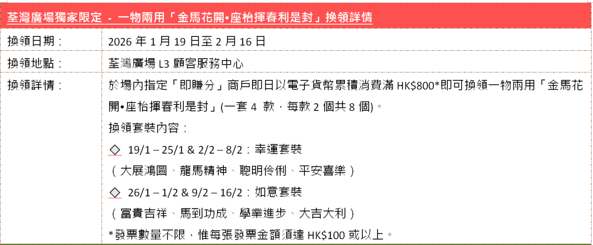 大家更可限量換領萌爆兼一物兩用「金馬花開·座枱揮春利是封」,結合新春裝飾與實用功能,送禮自用皆宜。