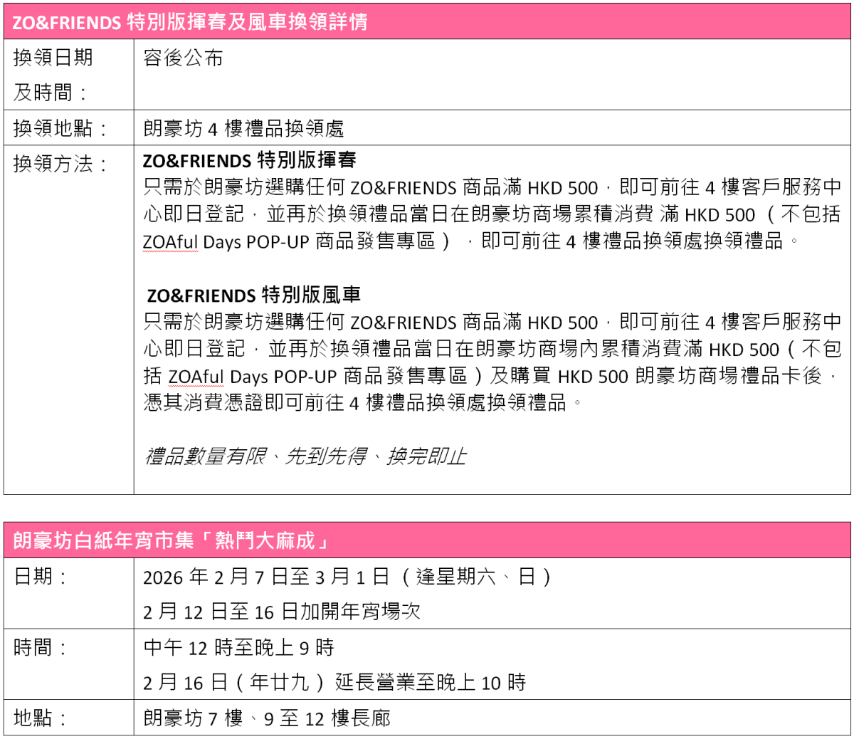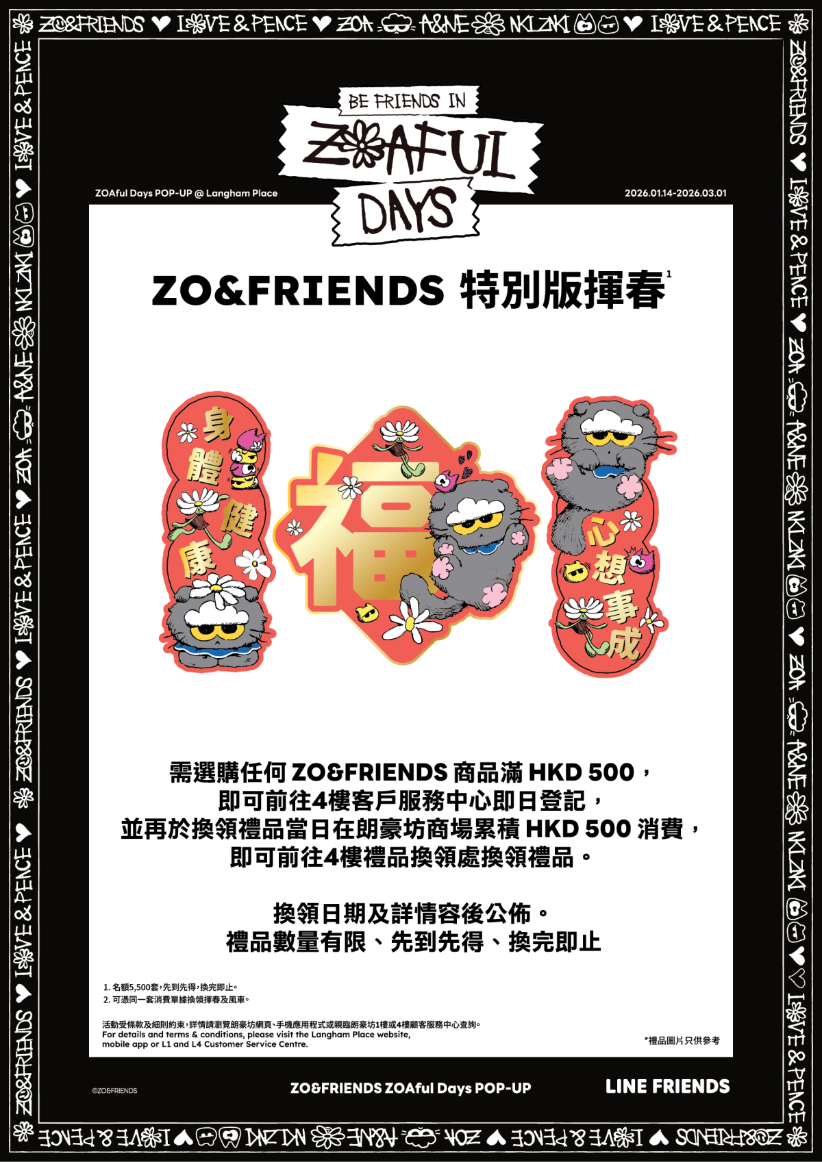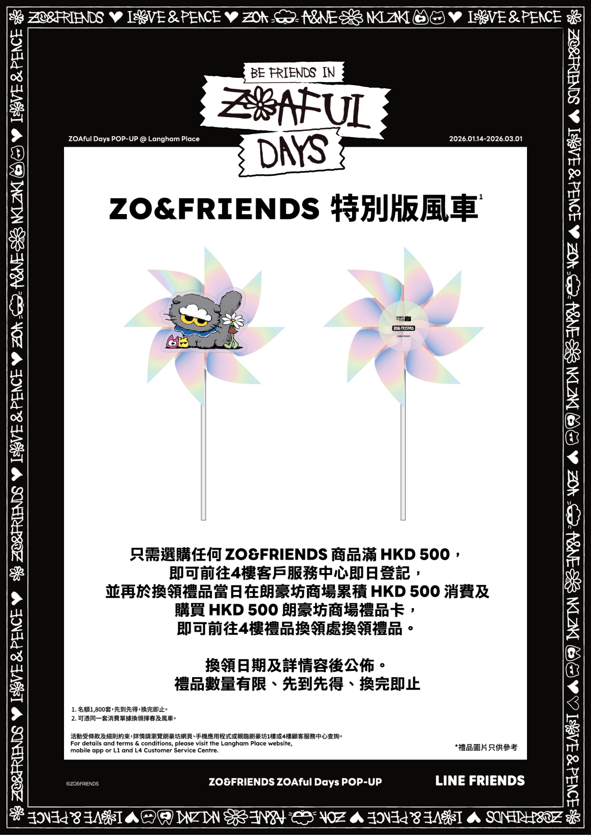 朗豪坊新一年以潮流視角重新演繹新春節慶,當中包括朗豪坊首次推出禮品卡,顧客於ZOAful Days POP-UP選購一系列限定商品及於場內指定消費,即可換領ZO&FRIENDS特別版揮春;加購港幣500元朗豪坊商場禮品卡後,更可額外換領特別版風車。