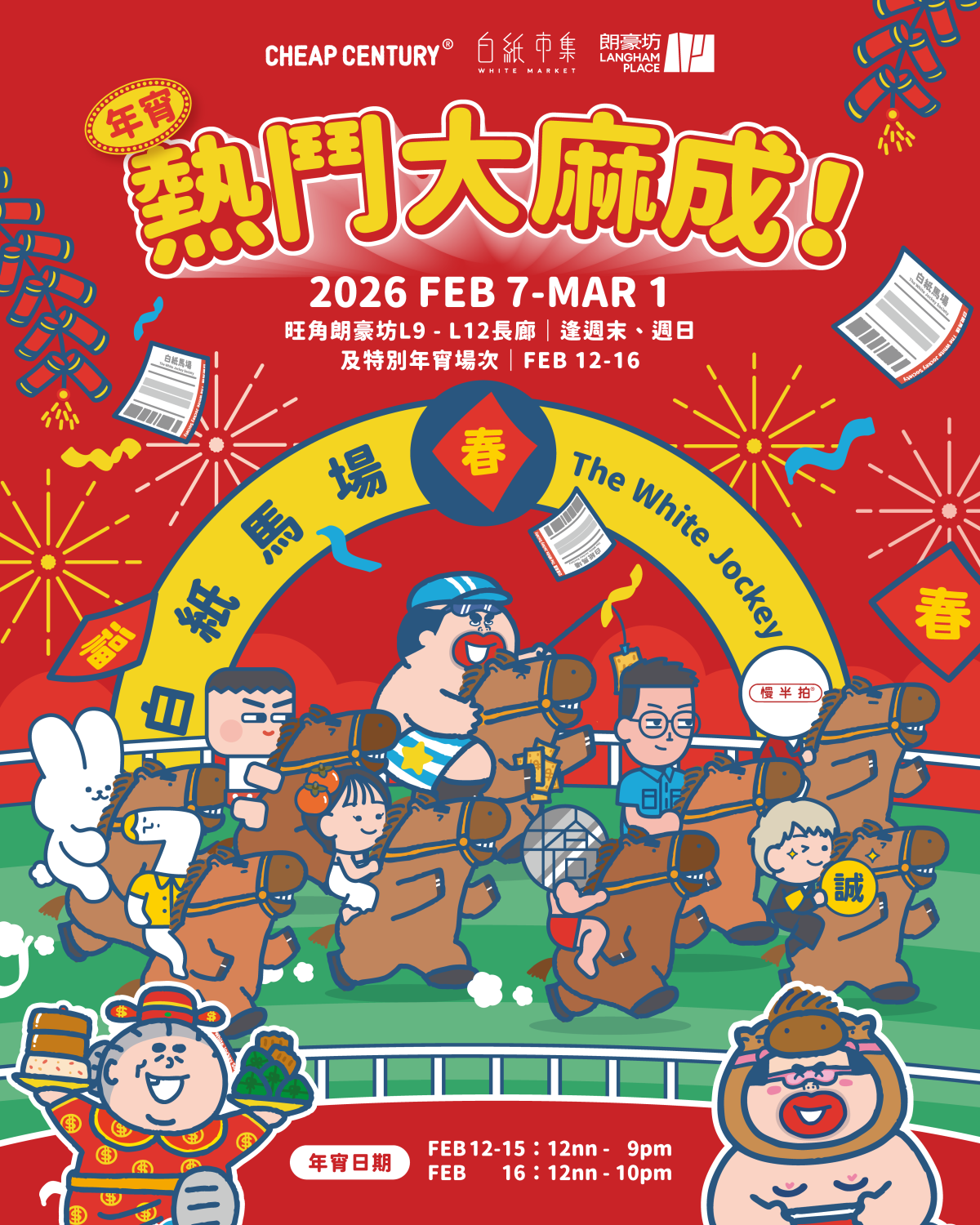 2月起,潮流核心向7至12樓延伸,白紙市集聯乘人氣插畫師大麻成策劃「馬場」主題年宵,結集多位人氣Creator擔任檔主,推出各款獨家產品。大麻成亦特別為今個馬年製作新春版Mascot「大馬成」,並將於2月12至16日年宵市集期間現身朗豪坊不同樓層,派發「白紙馬場幸運馬票」,成功捕捉「大馬成」的顧客,憑「幸運馬票」到12樓白紙生活概念館櫥窗及「幸運馬票兌換處」「對飛」,即有機會得到HK$20市集購物券,增添互動驚喜。其他顧客亦可憑券到指定市集攤位,完成指定任務即可免費換領IF椰青水,寓意「人人有獎、福氣滿載」,讓大家都能滿載喜悅,歡度佳節。