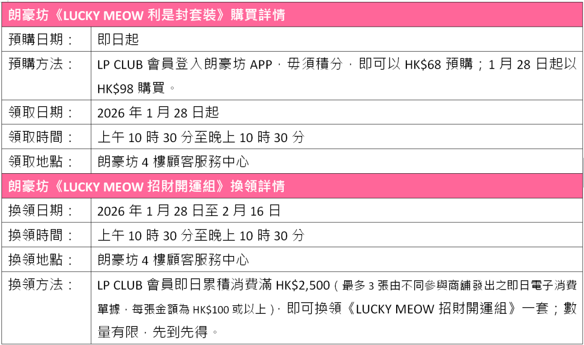同場亦與本地文創單位MUDLAB(泥社)推出以「LUCKY MEOW」為主題的限定賀年系列,LP CLUB會員可於朗豪坊APP以早鳥優惠價HK$68預購一套12個、共兩款設計的「LUCKY MEOW利是封套裝」。由1月28日起,累積消費滿HK$2,500即可免費換領限量「LUCKY MEOW招財開運組」,內含利是封及特別版「LUCKY MEOW」招財吊飾。