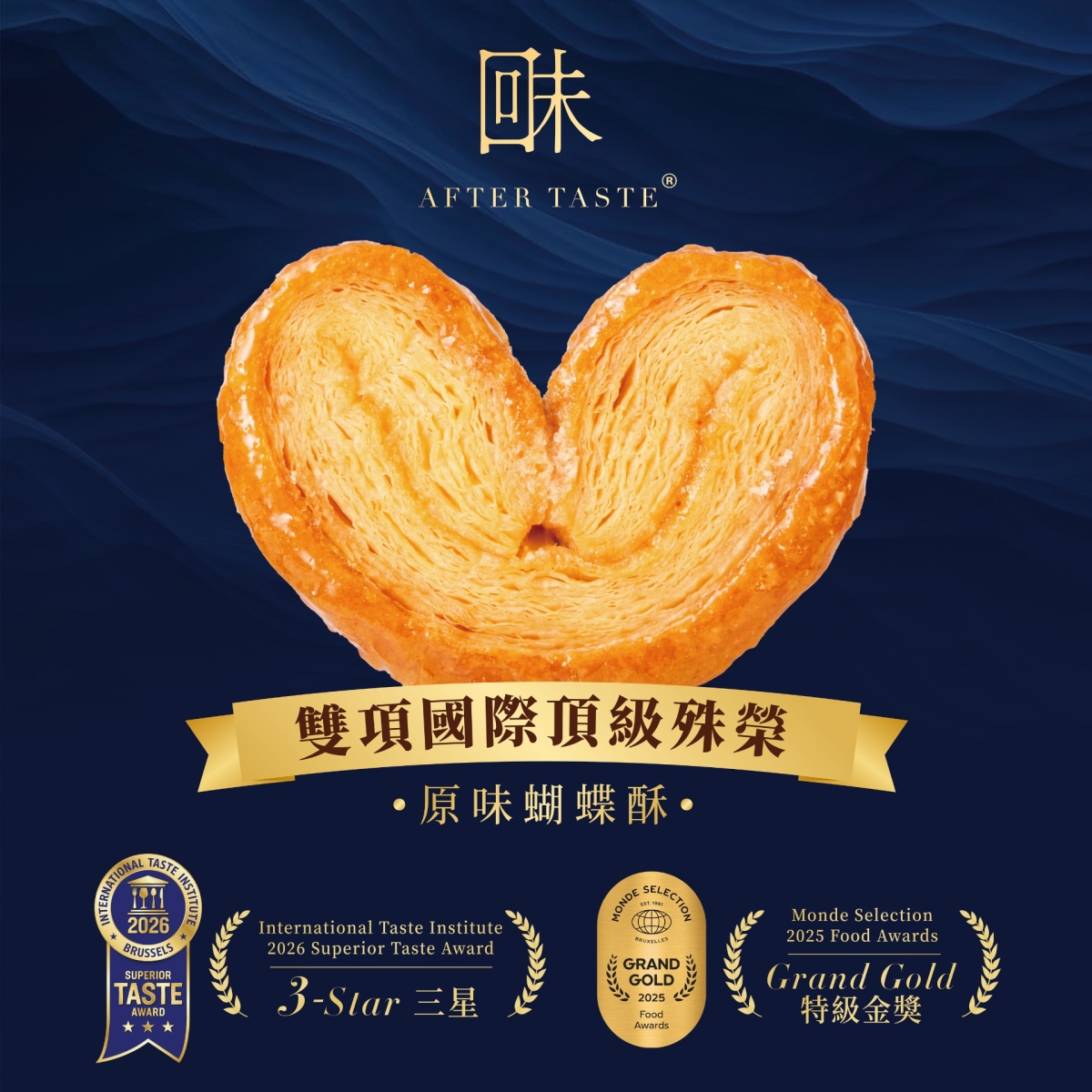 香港人始創品牌「回味」王牌產品「回味原味蝴蝶酥」獲頒國際風味評鑒所最高盛譽「風味絕佳獎章-3星」,連同去年Monde Selection最高榮譽「特級金獎」,雙項國際頂級殊榮,一舉成為雙料王者。回味以蝴蝶酥、特級牛油雞蛋卷及紫菜肉鬆鳳凰卷三款產品,憑藉其極致匠心橫掃國際獎,成就香港味道的精益求精。