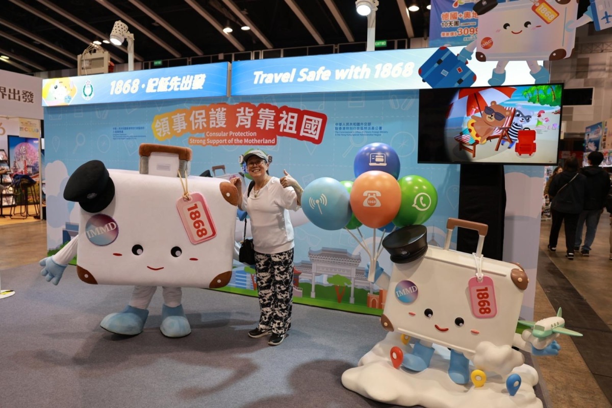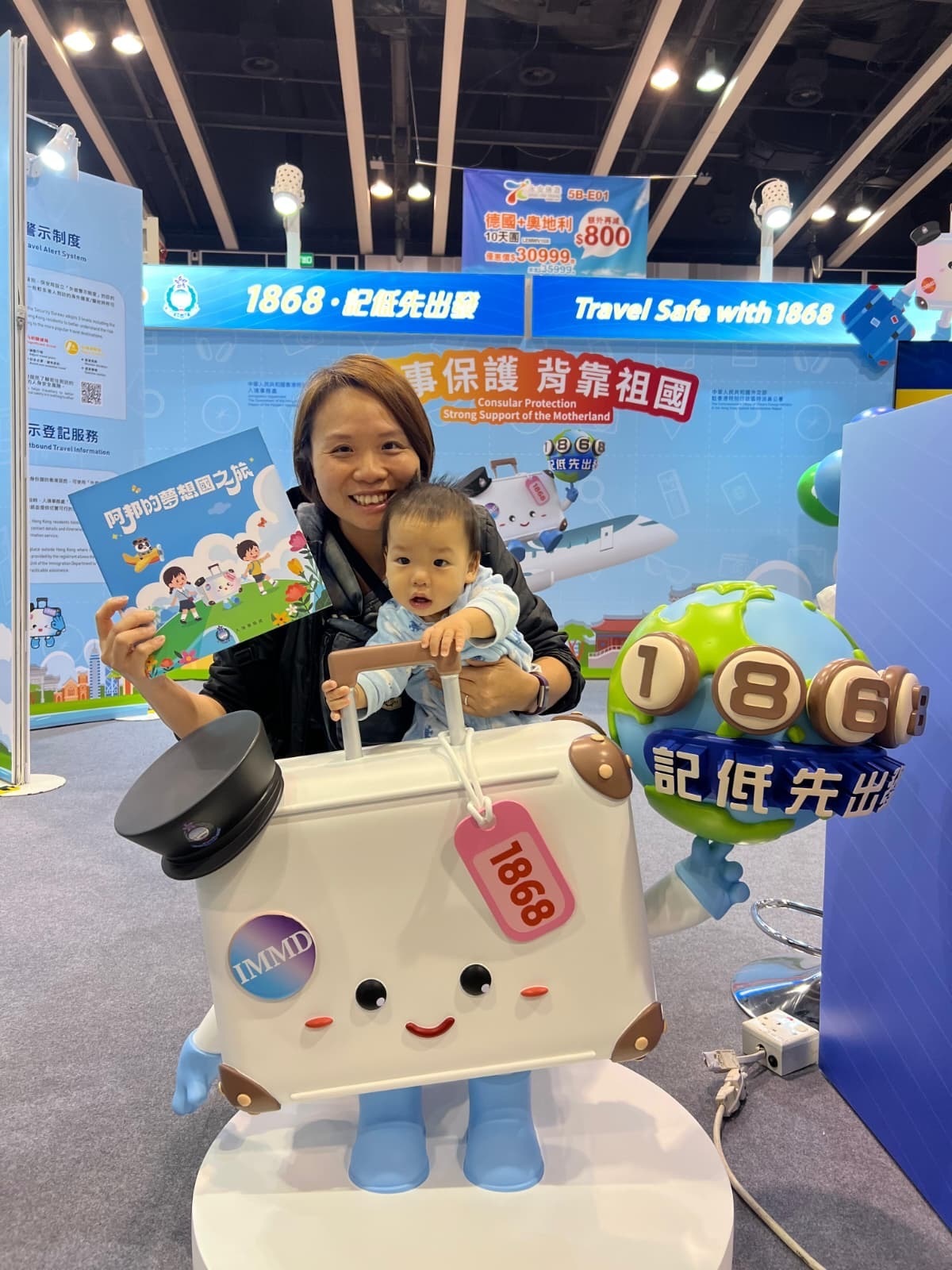 入境處「協助在外香港居民小組」吉祥物「1868大使阿邦」驚喜現身,冀藉此機會宣傳國家領事保護。農曆新年即將到來,阿邦亦為準備外遊的市民講解實用外遊小貼士。來到現場除了可以與阿邦合照,更有限量版阿邦月曆及精美紀念品派發,禮物送完即止,先到先得。