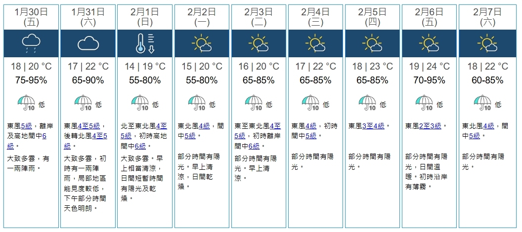 不過,有意賞花的市民還需抓緊時機。天文台預測,今日起本港風力將逐漸增強,並有一兩陣雨,至本周日(2月1日)市區(天文台尖沙咀總部)氣溫更會下降至約14度。天氣轉涼加上風雨影響,可能會加速花朵凋謝,縮短花期。