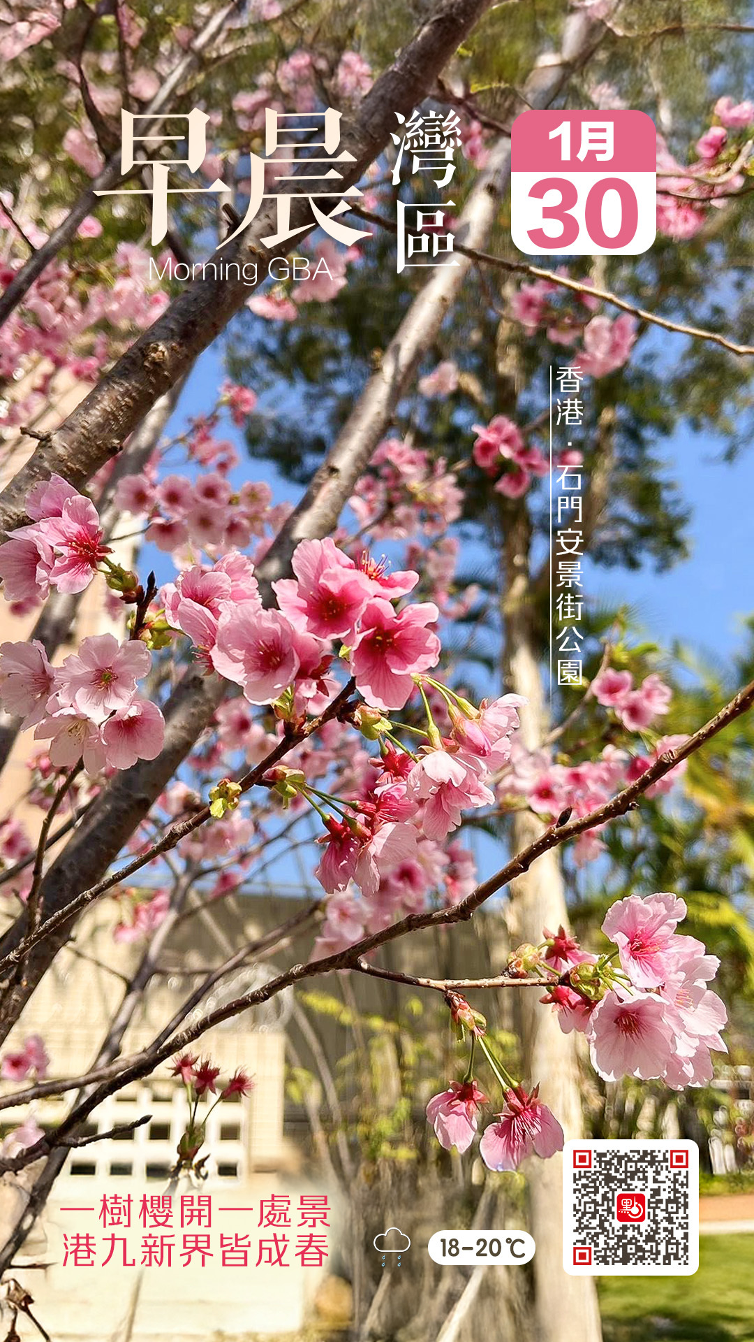 此外,本港多個地點如機場櫻花園、大埔海濱公園及天水圍公園等,亦栽種了不同品種的櫻花,預計近日將陸續迎來盛放。點新聞「發現灣區」欄目將持續為您追蹤各地花況,敬請關注!