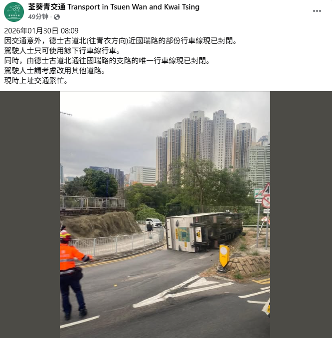 運輸署表示,受交通意外影響,德士古道北(往青衣方向)近國瑞路的部分行車線現已封閉。駕駛人士只可使用餘下行車線行車。同時,由德士古道北通往國瑞路的支路的唯一行車線現已封閉,駕駛人士請考慮改用其他道路。現時上址交通繁忙。