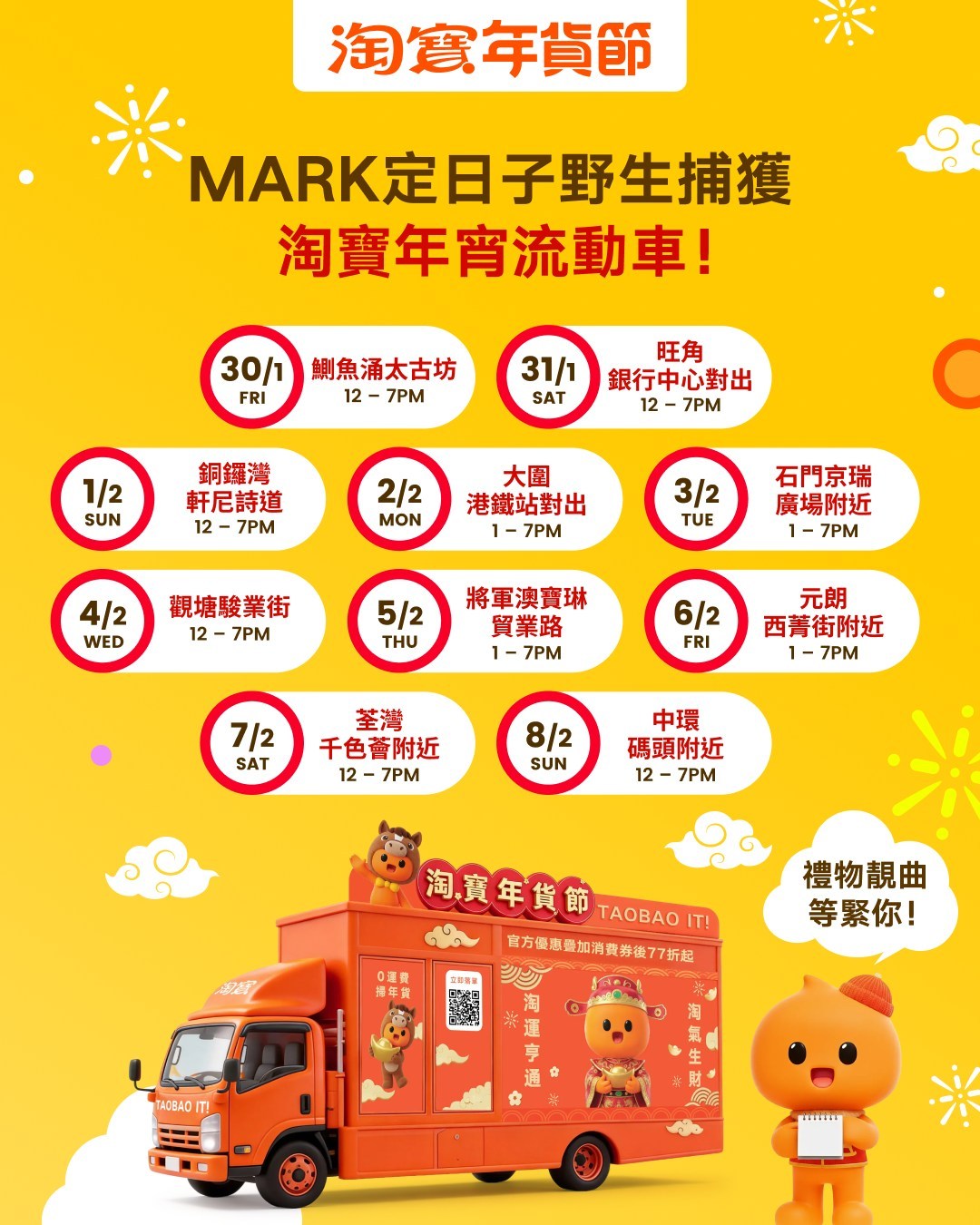 【點新聞報道】農曆新年將至,今日(30日)開始,淘寶準備行勻港九新界同大家拜早年,送大禮派靚曲!快啲Mark實日期時間同地點,約埋朋友同事屋企人一齊去攞禮物啦!