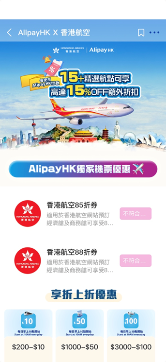 活動期間,AlipayHK亦會於每天早上10時大派旅遊消費券,包括「滿$200減$10」、「滿$1000減$50」及「滿$3000減$100」,這些消費券更可用來與香港航空官方平台的「早鳥8折」優惠疊加使用,變相提供「折上折」優惠,讓用戶以更驚喜價錢入手心儀機票。(點此了解活動詳情)