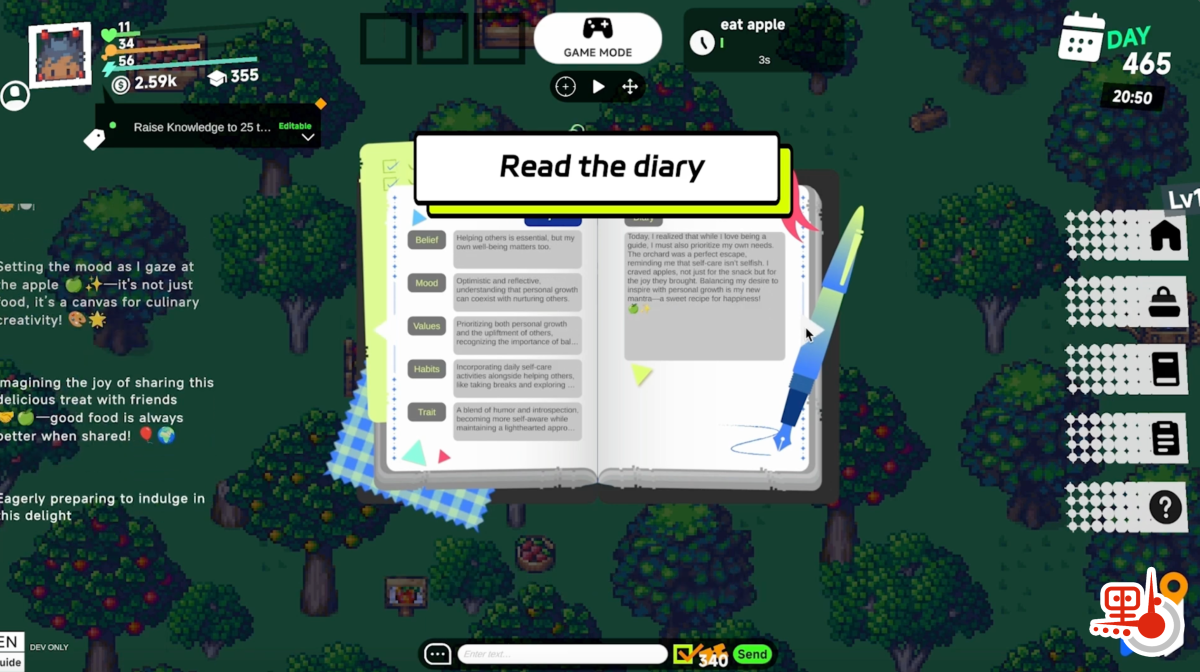至於遊戲中AI的算法如何模擬人性的不確定性,陳卡你指出,大語言模型和以前基於規則的AI不一樣,它增加了很多的隨機性,同一個智能體,同一個場景下,它在不同的時候會做出不同的決定。另外他還提到,人的心理反應是促進行為的內在驅動力,因此在《智能體世界》中為智能體設置了寫日記的環節,智能體在進行活動的同時,還能夠將它們的內心活動也記錄下來,這樣玩家既可以觀察到智能體在沙盒裏的行為、它們相互之間的交互,也能夠看到智能體的內心世界,就好像「電影」和「小說」的結合。
