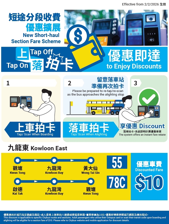 【點新聞報道】城巴將於2月2日(星期一)起,為油尖旺、九龍東、將軍澳、新界東及大嶼山等多條路線推出全新的「上落拍卡 優惠即達」短途分段收費安排,包括55、78C、796X、798、795、79、N796等,進一步擴大受惠客群,鼓勵市民善用公共交通出行。乘客只需支付低至10元的優惠車費,即可在日間及通宵時段於區內穿梭。