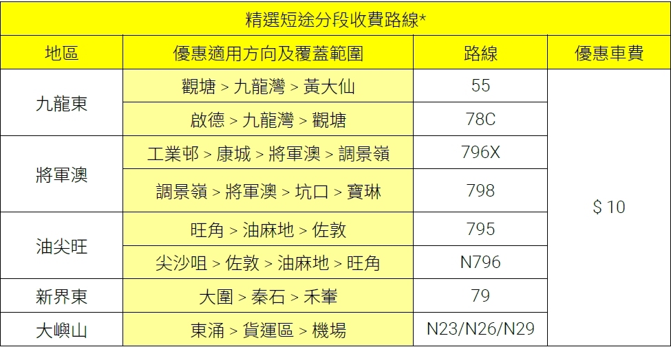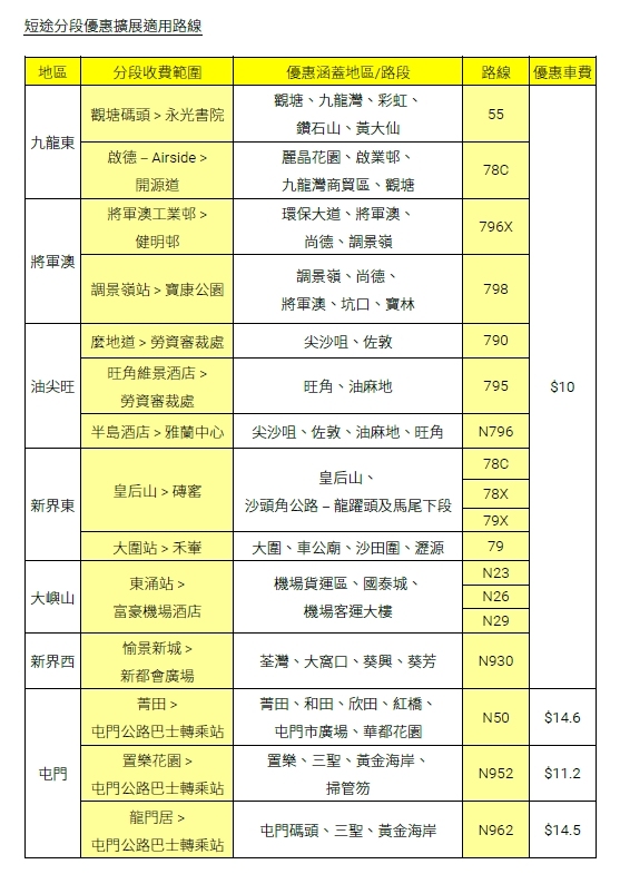 城巴此次擴展短途分段收費計劃,適用於近20條新發展區路線、熱門路線及通宵路線,提升油尖旺、九龍東、將軍澳、新界東及大嶼山等地的交通便利性。乘客於大部分適用路線上,實際可享受的分段收費優惠車費低至10元,部分路線更能節省高達20元。