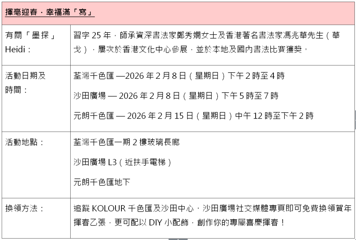 商場推出「揮毫迎春·幸福滿『寫』」,由新派書法大師「墨探」Heidi即席揮毫,配以DIY小配飾,構成獨一無二的揮春。
