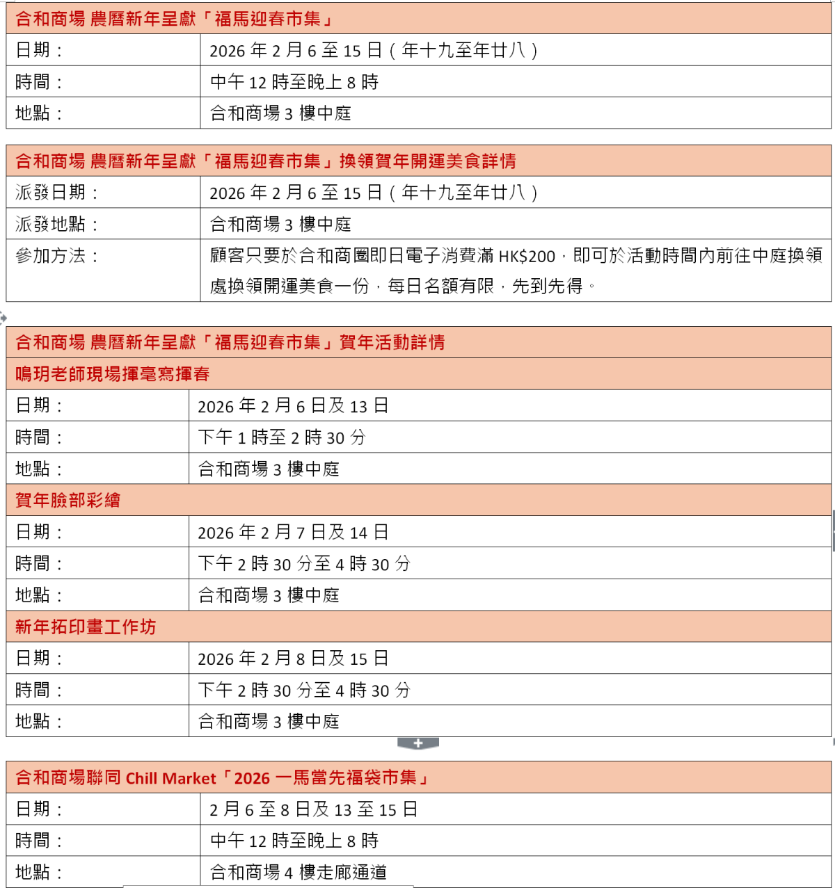3樓中庭將設逾4米高巨型桃花樹,在2月14日情人節下午1時及5時更有派發玫瑰花活動,傳遞浪漫氣氛。穿上「合和」二字紅色催運馬鞍的白馬,寓意團圓與財富的湯圓及餃子、巨型開運御守、賀年三色糰子亦將來到中庭,祝福大家新一年萬事和合、馬到功成!記得參與連串賀年活動包括新春Busking Show、寫揮春、賀年臉部彩繪等,以熱鬧喜慶迎接丙午馬年。2月6日至8日及2月13日至15日,合和商場將會聯同Chill Market舉辦「2026一馬當先福袋市集」,預計每期超過20間本地小店參與,售賣賀年年貨、福袋、小食、飾物、寵物賀年衣服及用品等,買盡整個新年!