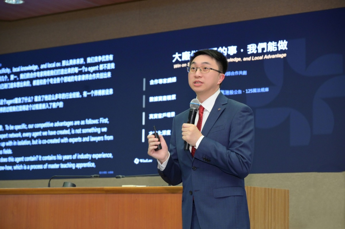 香港理工大學可持續技術基金會教授、智法數科創始人陸海天展示「下一代法律服務人工智能體系統」四大核心產品,包括具備處理複雜跨境合規諮詢的WiseChat,高效合同審查功能的WiseTools,實現一站式智能檢索的WiseSearch,及已投入使用的「AI Tutor」系統WiseCourse,以精準針對法律實務中的痛點。