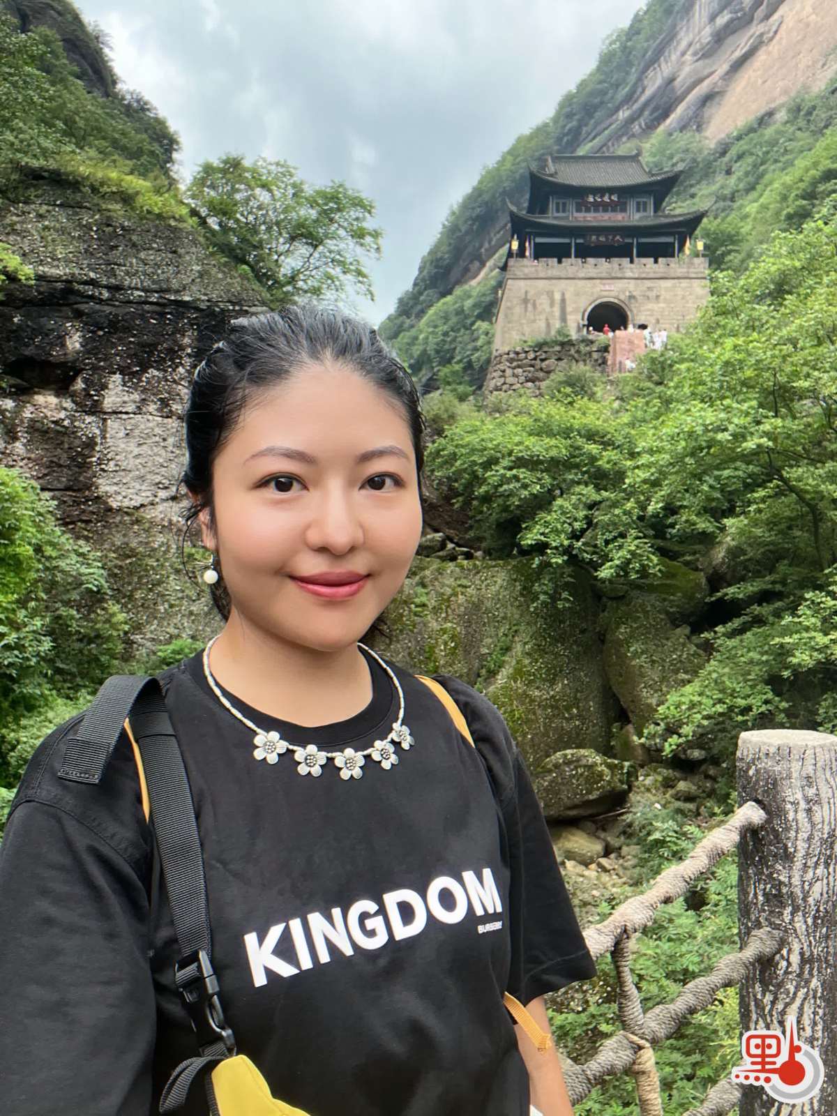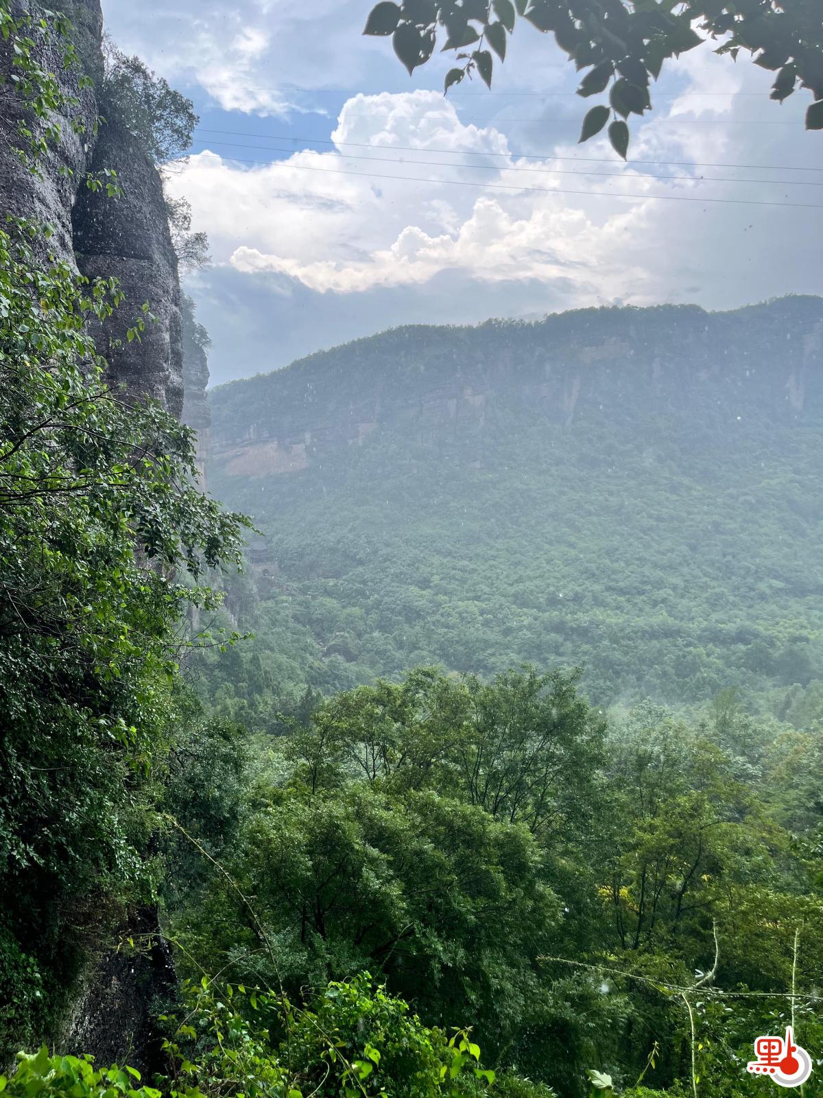 正想着,天色驟變。方才還明朗的晴天,轉眼就下起傾盆大雨,打濕了本已滑溜狹窄的石階。我正蹣跚攀爬一座高約80米的石筍峰,見雨勢洶湧,剛才還能看見遠處山脊的輪廓,轉眼就被雨線擦掉,能見度只剩前方二三十米,只得尋一塊稍微平坦的大石暫歇。當我撐着傘獨立於崖側,心裏竟生出幾分超然。