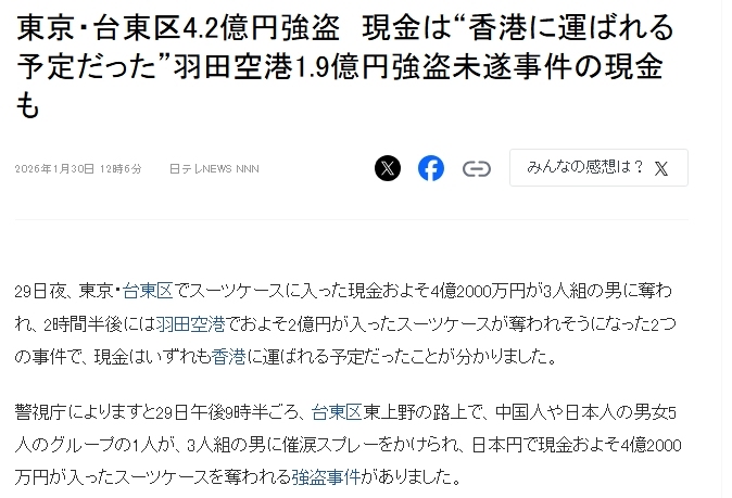 【點新聞報道】日本東京台東區前日(1月29日)發生4.2億日圓劫案,遇劫的5名解款員報稱受貴金屬商店委託,每日將現鈔運往香港,再兌換成港元,店家承諾每人每日可獲發數萬日圓報酬。東京警視廳相信,在逃匪徒可能事先收到情報,有人運送大量現金,繼而犯案,正追查他們下落,亦正調查與昨日(1月30日)羽田機場1.9億日圓搶劫未遂案,是否同一夥人所為。
