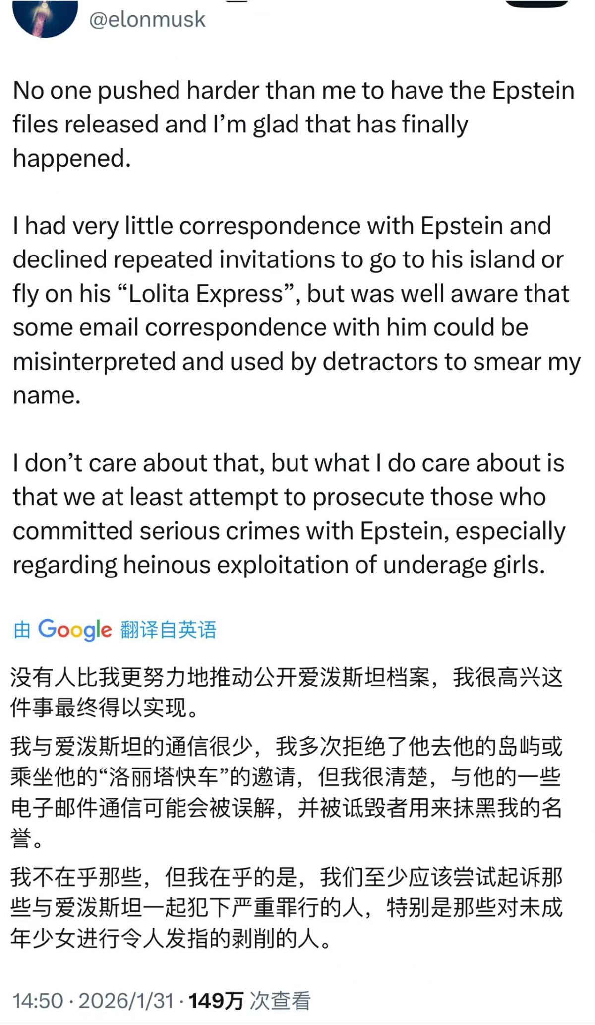 「沒有人比我更努力地推動愛潑斯坦案文件的公開了,我很高興這件事終於實現了。」馬斯克寫道。他還稱,自己與愛潑斯坦的通信往來「極少」,且「多次拒絕」前往愛潑斯坦的私人小島,「但我很清楚,與他的部分郵件往來可能會被曲解,並被反對者利用來詆毀我的聲譽」。