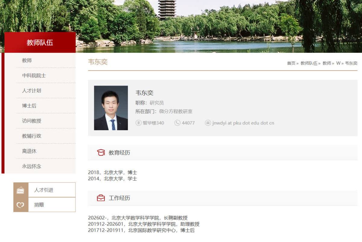【點新聞報道】據北京大學數學科學學院網站信息,從2026年2月起,該院教師韋東奕正式獲聘北京大學長聘副教授。
