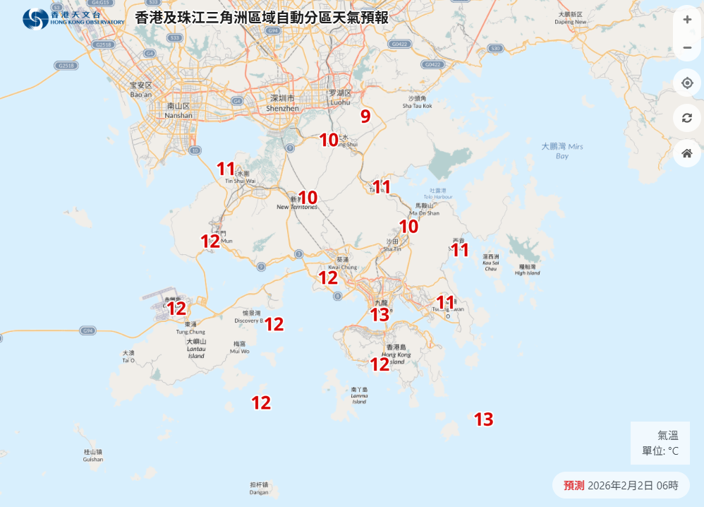 【點新聞報道】東北季候風正為廣東地區帶來寒冷天氣,粵北地區今早(2月1日)一度發出寒冷橙色預警;而本港今早清涼,多區跌至12度左右,天文台一度發出寒冷天氣警告,至下午有所回暖。不過,香港天文台預料明早(2月2日)市區最低氣溫約13度,新界再低兩三度,部分地區寒冷。