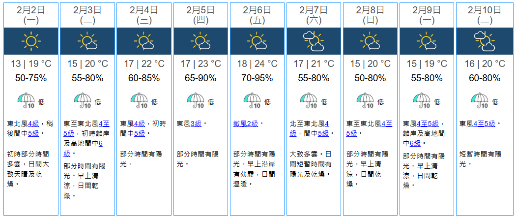 天文台展望隨後兩三日部分時間有陽光,早上天氣清涼;隨着季候風被一股偏東氣流取代,本周中後期華南沿岸氣溫逐步回升,天氣漸轉潮濕,星期四及星期五日間溫暖。根據天文台九天天氣預報,未來幾日氣溫回暖,至星期三「立春」(2月4日)最高氣溫或達24度,日間溫暖。惟「立春」過後又見降溫,天文台預料一股東北季候風會在周末影響華南,隨後一兩日該區天氣轉涼。