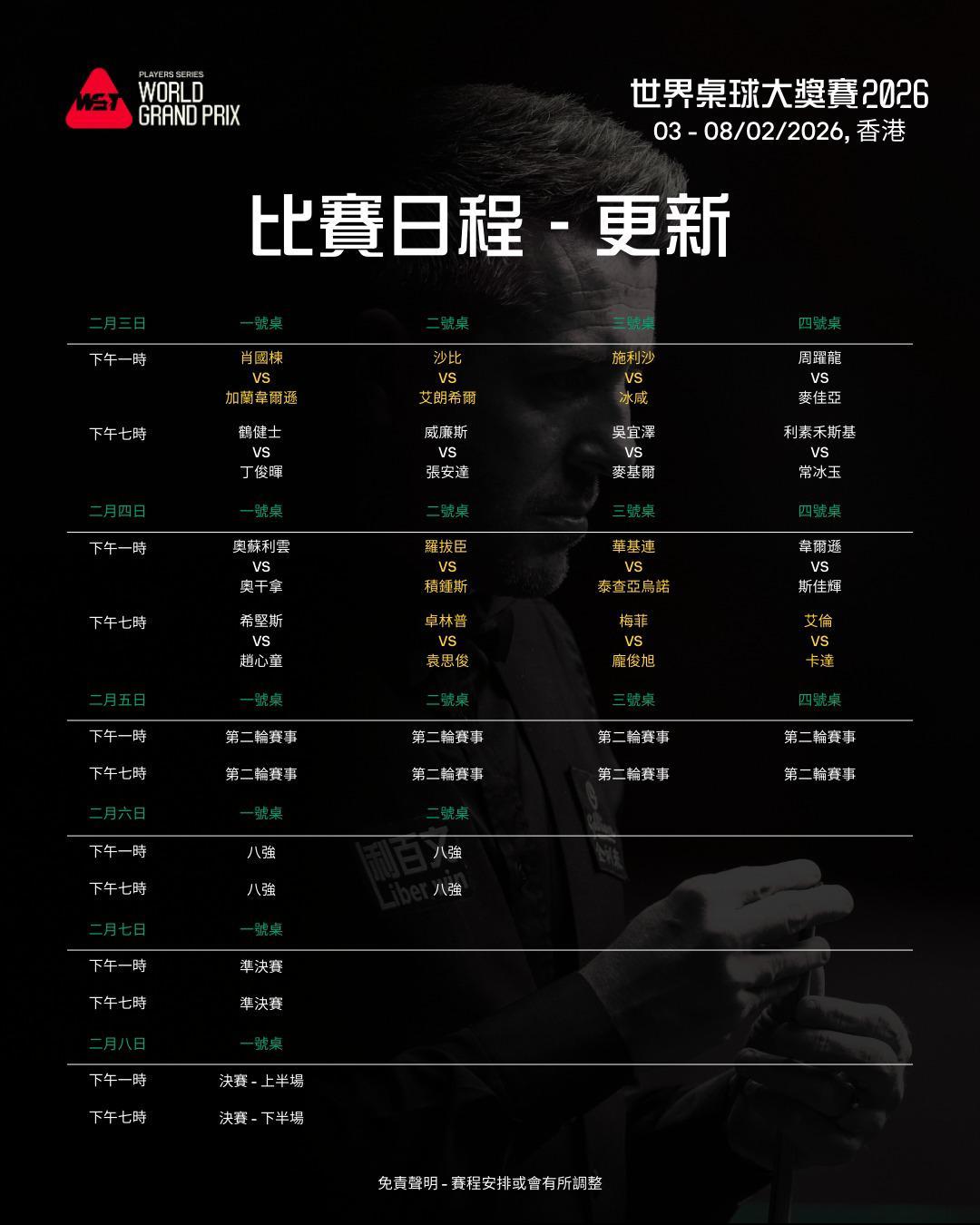 【點新聞報道】「世界桌球大獎賽2026」(又譯斯諾克世界大獎賽2026)將於2月3日至8日再度於香港隆重登場。來自全球排名前32名的頂尖桌球高手將雲集啟德體育園內的啟德體藝館,爭奪冠軍榮譽及世界排名。因應德國桌球大師賽最新賽程,包括羅拔臣及卓林普等部分球手需要更新行程,世界桌球巡迴賽(WST)今日公布「世界桌球大獎賽2026」最新賽事安排:於2026月2月1日晚上8時前,已購買受影響場次門票的觀眾,可憑票按原定時段入場觀賽,並可額外領取2月3日至5日任何一場門票(同等價值)。所有票務程序將於啟德體藝館地下進行,時間為中午12時至晚上9時。