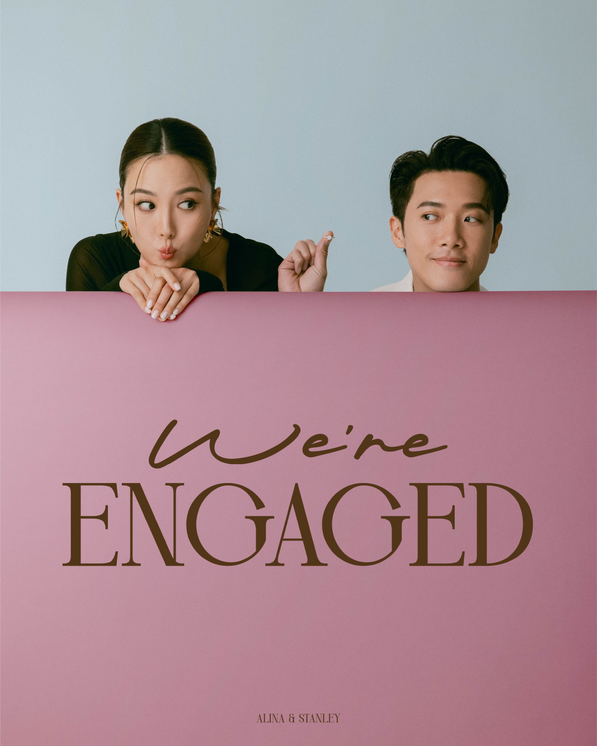 隨文公開的四張照片展露甜蜜。首張是以「We're Engaged」為題,照片中Stanley手持婚戒,Alina在旁露出鬼馬俏皮的笑容;第二張「Looks like you're officially my problem now」,是二人身穿禮服Alina甜笑依偎在Stanley身旁,臉上洋溢幸福光彩;第三張「We're getting married」特寫兩人緊握的雙手,Alina無名指上的訂婚鑽戒閃耀動人;最後一張是兩人的親筆手寫信,為這份喜訊留下最美、最動人的註腳。