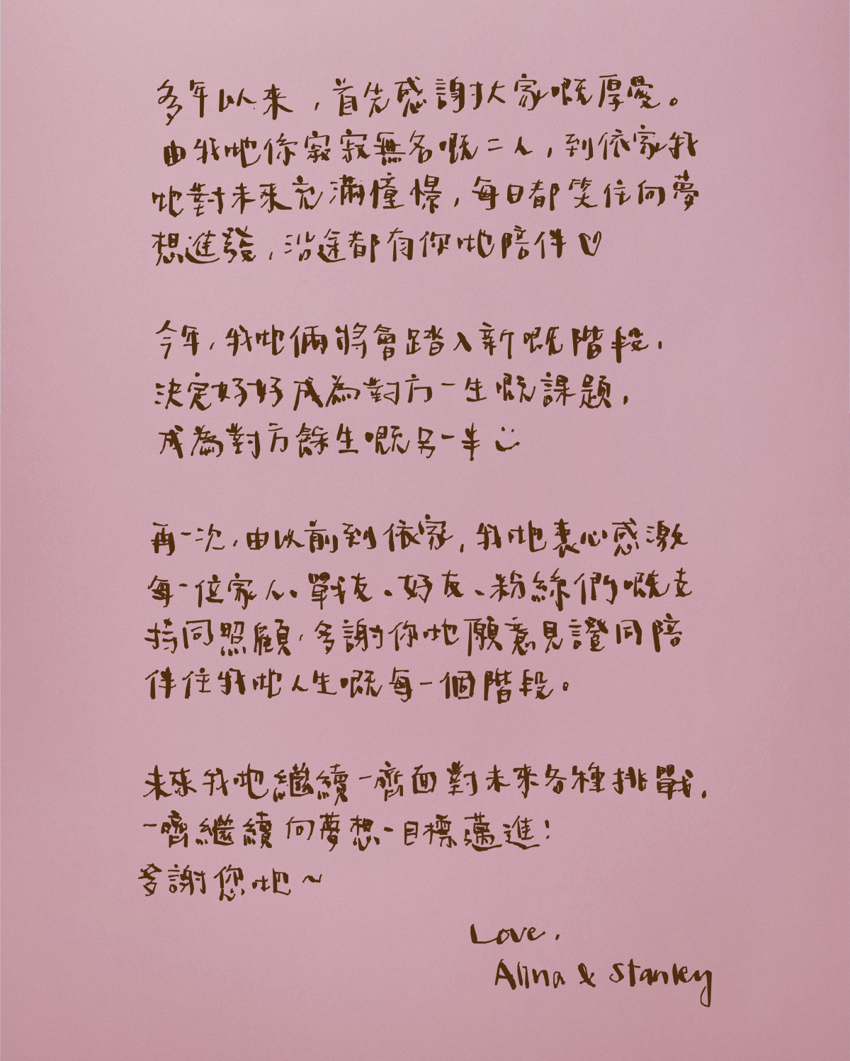 在甜蜜公告中,Stanley與Alina以親筆手寫信表達真摯情感:「多年以來,首先感謝大家嘅厚愛。由我哋係寂寂無名嘅二人,到依家我哋對未來充滿憧憬,每日都笑住向夢想進發,沿途都有你哋陪伴。」字裏行間充滿對未來的期待。