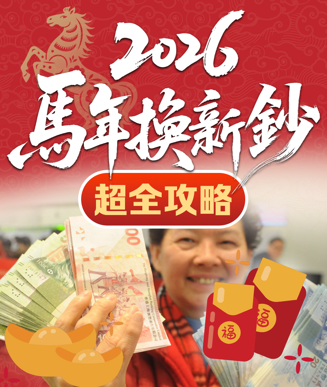 ♢滙豐銀行網上預約換領新鈔配額已滿,市民可於2026年2月3日至16日早上前往分行即場取籌換領新鈔或迎新鈔套裝。
