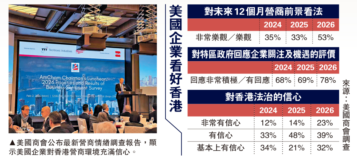 香港國安法壓艙穩舵逾5年以來,充分發揮「壓艙石」與「定海神針」作用,令社會迅速回復安定秩序,營商環境持續優化。多項數據清晰反映,「香港故事」對外資的吸引力有增無減。香港美國商會昨日(2日)發布《2026年商業情緒調查結果報告》顯示,有94%美企對香港法治投下「信任票」,較2025年83%再大幅增加11個百分點,創調查以來最高紀錄。同時,有74%美企表示公司營運並未受到香港國安法帶來負面影響,此比例是連續第4年攀升,今年再升4個百分點。