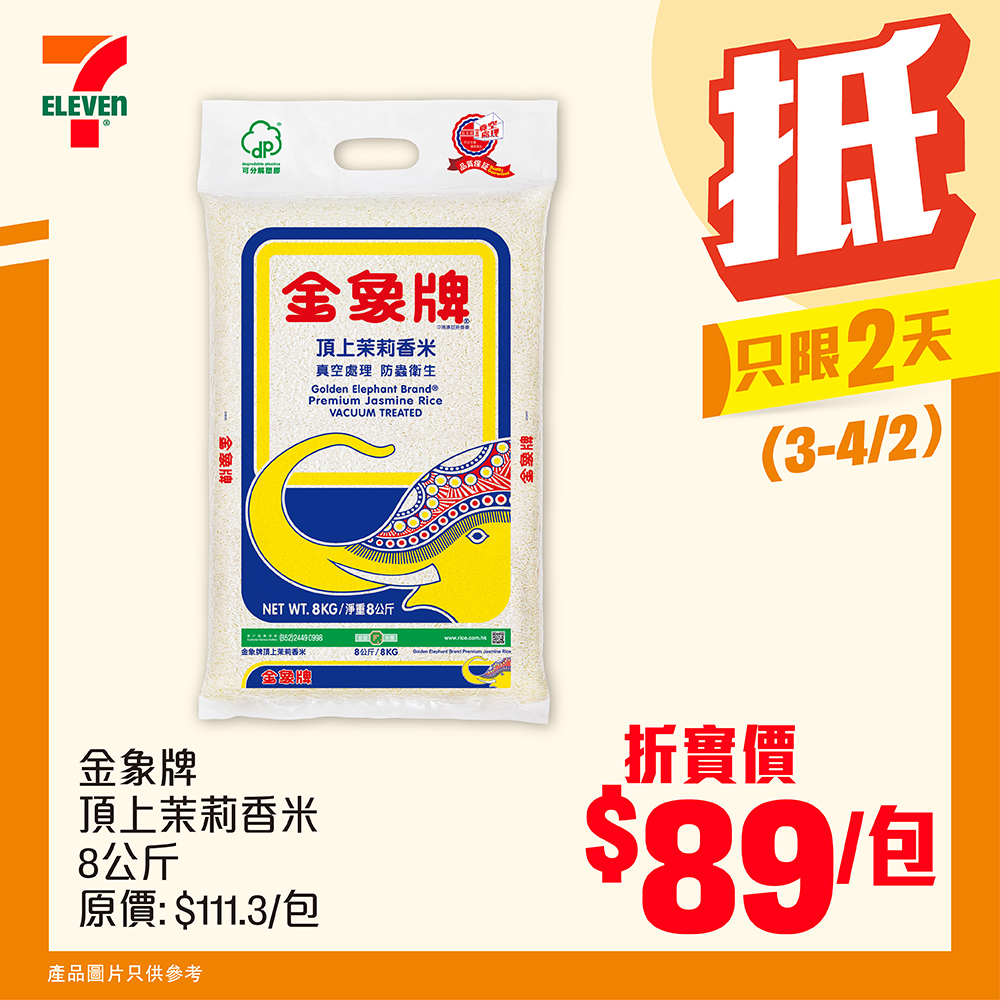 【折實價$89/包】 金象牌頂上茉莉香米8公斤