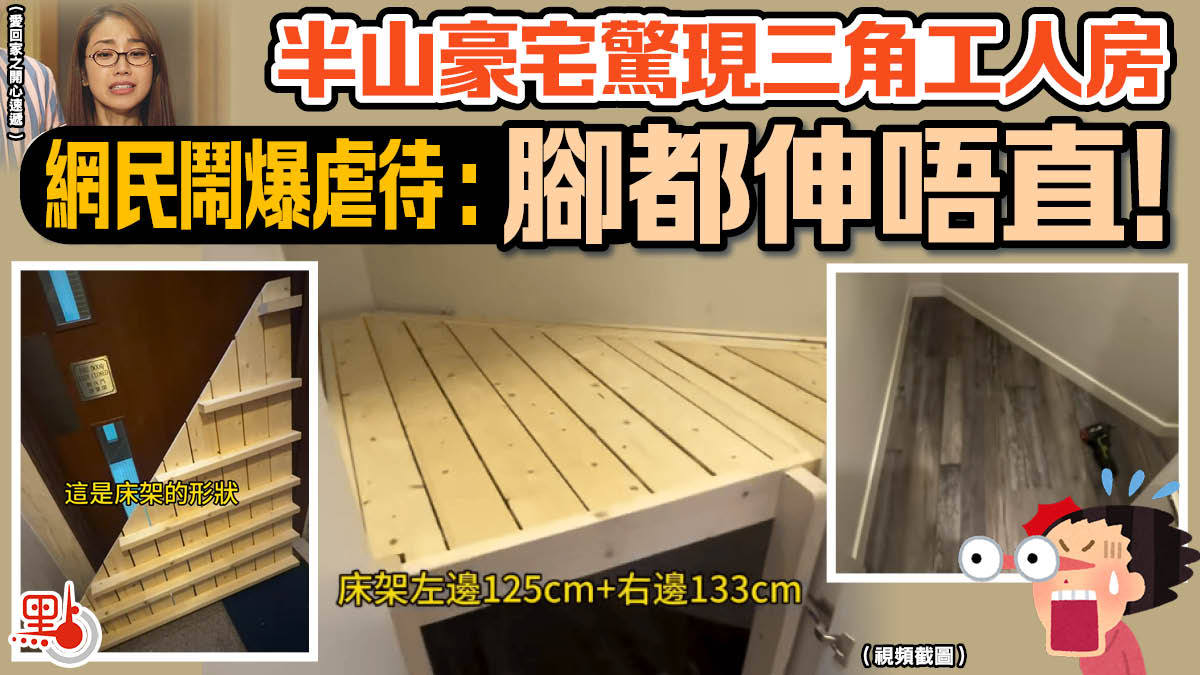 【點新聞報道】香港寸金尺土,近日有半山豪宅工人房的誇張設計流出,有僱主竟將僅0.5平方米大的三角形儲物空間改裝成菲傭卧室,不少網民斥設計「腳都伸唔直!」、「做佢工人慘X過坐監」,形同虐待。