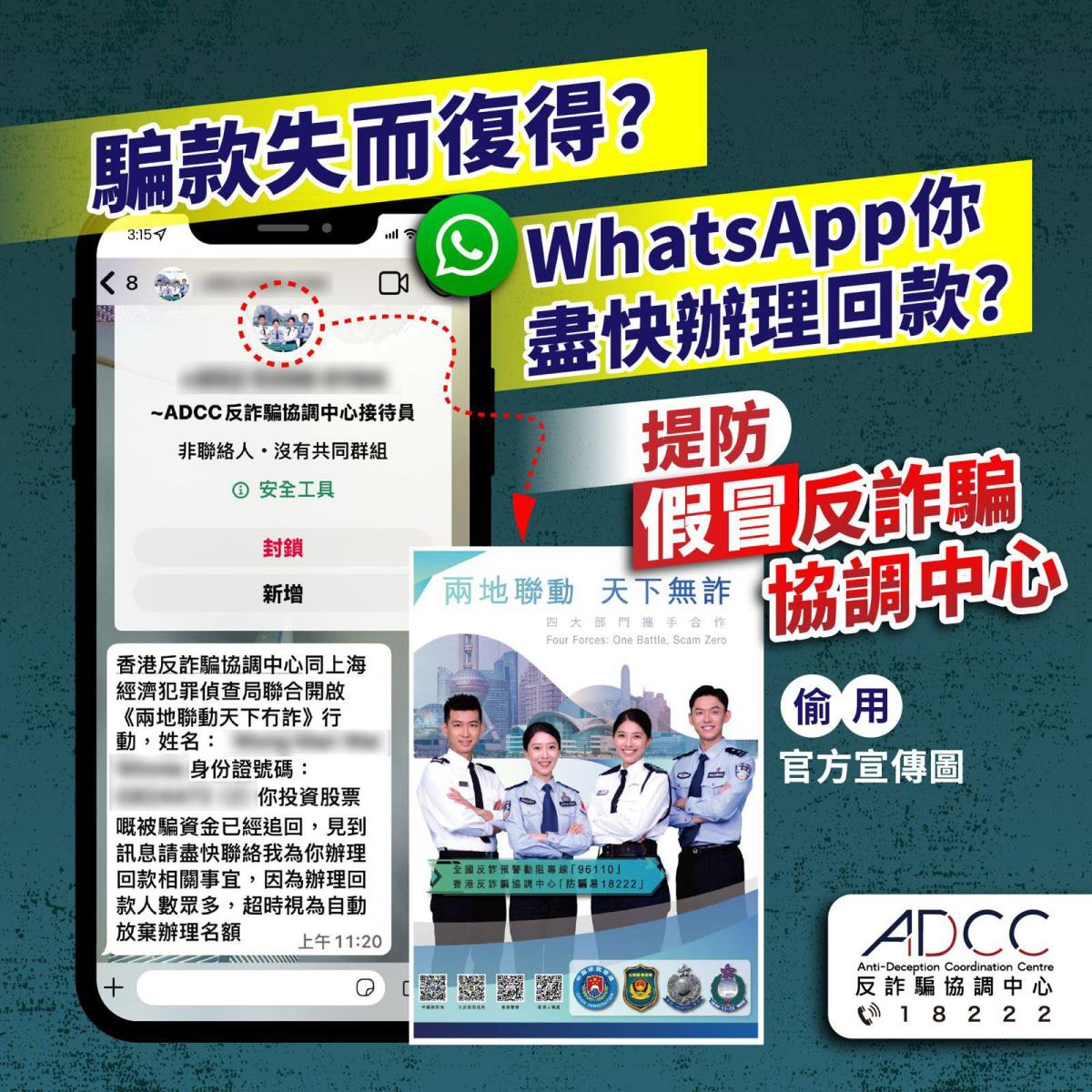 【點新聞報道】警方今日(3日)在社交平台發文,指近日有騙徒冒充反詐騙協調中心(ADCC),以WhatsApp聯絡曾受騙的市民,聲稱「中心已成功追回被騙款項,請盡快聯絡辦理退款,否則視作自動放棄。」騙徒更盜用官方「兩地聯動,天下無詐」的宣傳圖同口號,以增加可信度。警方呼籲市民切勿相信,如懷疑受騙,即打「防騙易18222」熱線查詢。