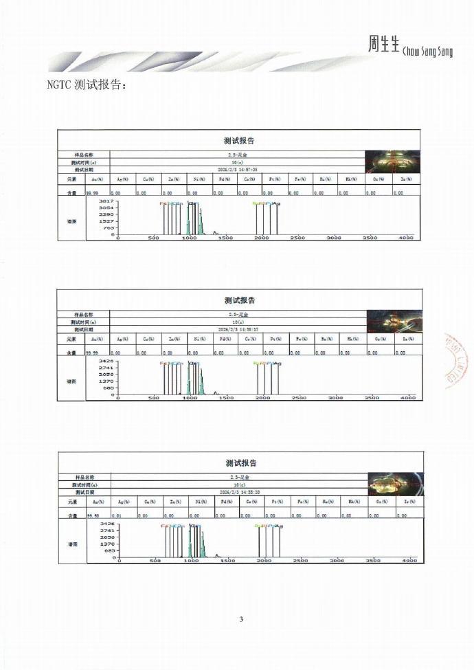 今日晚間,周生生官方微博再次發布情況說明:「我們充分理解顧客好公眾的顧慮,針對顧客反饋的相關情況,我司高度重視,第一時間覆核了當時出廠批次的破壞性檢測報告,報告顯示該批次貨品質量完全符合國家相關標準。同時,今日2月3日,我司已將同批次同款福袋送檢至國家珠寶玉石首飾檢驗集團有限公司(NGTC),採用X射線熒光光譜法(XRF)進行檢測,該福袋貨品的檢測結論為足金飾品(報告編號:P-ZSSA2121621)。NGTC對該貨品隨機選取3個檢測點,檢測所得金含量結果依次為99.99%、99.99%、99.98%。感謝社會各界的關注和監督,我司正全力配合相關部門開展工作,相關進展我們將及時公布。」